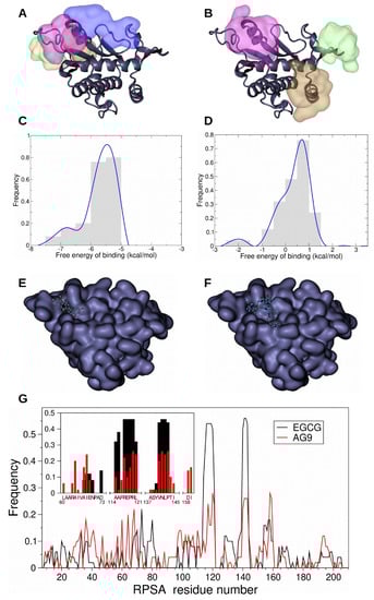 Docking experiments of green tea-derived polyphenol EGCG and AG-9 peptide onto RPSA were performed using Autodock software and evidenced the existence of 4 preferred area of interaction (PAI) for EGCG (A) and 3 PAI for AG-9 (B). The color code used for the representation of PAI is linked to their population: the most populated one is represented in pink, the second in green, the third in brown, and the fourth in blue. Comparison of the 50 best results of EGCG and AG-9 docking experiments displays an overlapping area (pink PAI). Frequence distribution diagrams of the free energy of binding of the 50 best poses of EGCG onto RPSA demonstrated that those free energies of binding are comprised between −7.75 and −4.75 kcal/mol. The most frequent poses have a free energy of binding of −5.5 kcal/mol (C). For AG-9 peptide, the free energy of binding of the 50 best results of docking onto RPSA is comprised between −2.75 and +1.75 kcal/mol and the energy of binding of the most frequent position of AG-9 onto RPSA is around 0.75 kcal/mol (D). The best docking poses of EGCG (E) and AG-9 (F) are located on the same area at the surface of RPSA. Comparison of the frequency of contacts made by RPSA residues with the 50 best results of EGCG (black line) and AG-9 (red line) reveals two favored regions (frequency above the threshold of 0.2) of the protein (G). A focus on the poses associated with the first cluster of EGCG and AG-9 (G/close-up) allows the identification of the following hot spots (frequency above the threshold of 0.2 for the two ligands): R117, 120RL121, and the sequence 140VNLP143.