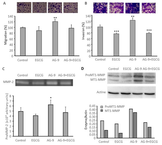 Incubation with 10µM EGCG slightly decreased CAL 27 migration (−11%; Figure 6A) and significantly decreased cell invasion (−23%; Figure 6B) and it abolished AG-9 stimulatory effect (Figure 6). It also slightly decreased MMP-2 secretion and MT1-MMP expression (Figure 6C,D). This is in accordance with previously published papers []. Incubation with EGCG also prevented AG-9 stimulatory effect on cell migration (Figure 6A), invasion (Figure 6B), as well as on MMP-2 secretion (Figure 6C) and MT1-MMP expression (Figure 6D).