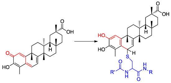 Natural products have been used to date as a convenient source of potential lead compounds in the framework of drug discovery and development and they are now re-emerging as pivotal sources of chemical diversity in the post-genomics era [1]. Among them, plant-derived traditional remedies represent promising drug candidates due their potent pharmacological effects and generally encouraging toxicity profiles [2,3,4]. Celastrol (CE, Figure 1) is a naturally occurring biomolecule extracted from the traditional Chinese medicinal herb Tripterygium wilfordii, commonly referred to as ‘Thunder of God Vine’ [5,6]. Chemically, CE belongs to the class of natural quinone-methide triterpenes and possess a six-membered based pentacyclic structure which further classify it as a pentacyclic triterpenoid. Throughout the years the pharmacological profile of CE has been largely investigated highlighting its ability to modulate a variety of molecular targets both via the formation of covalent Michael adducts and/or by establishing non-covalent interactions (Figure 1) [7].