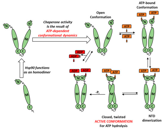 In eukaryotic cells, the activity of Hsp90 is finely regulated by modulating its cytosolic expression and by the action of specific allosteric ligands. These are small proteins or peptides able to positively or negatively modulate the kinetics of Hsp90 ATP-dependent chaperone cycle by perturbing its complex conformational dynamics (Figure 3) [30].