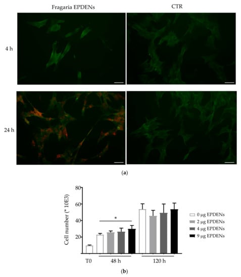 Effects of Fragaria-derived EPDENs on ADMSCs. (a) Uptake of Fragaria-derived EPDENs by ADMSCs. The uptake of the fluorescently labeled EPDENs (red) was evident in ADMSCs after 24 h of incubation. No stain was revealed in the untreated cells (CTR). Actin filaments were stained with a FITC-conjugated phalloidin (green). Scale bar: 10 µm. (b) Effect of Fragaria-derived EPDENs on ADMSC viability. Cells were treated with the indicated concentration of EPDENs for 48 h and 120 h. Data are reported as the cell number (mean ± SD, * p < 0.05).