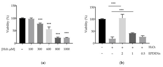 Effect of Fragaria-derived EPDENs on oxidative stress in human ADMSCs. (a) Dose-dependent effect of H2O2 on cell viability (n = 3) (*** p < 0.001 vs. CTR); (b) Dose-dependent effect of Fragaria-derived EPDENs (µg/mL) on H2O2 (400 µM)-induced cytotoxicity (n = 4) (*** p < 0.001).
