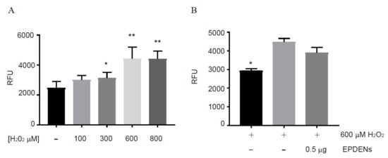 ROS were detected by the 2′,7′-dichlorofluorescin (DCFH) method. Briefly, ADMSCs were pretreated with EPDENs (0.5 µg/mL) for 24 h followed by 600 μM H2O2 exposure for 1 h. The H2O2 concentration that significantly increased ROS production was determined from a dose–response curve ranging from 0 to 800 µM H2O2. ADMSCs were washed and then incubated with 10 μM 5- and 6-carboxy-2′,7′-dichlorodihydrofluorescein diacetate (CM-H2DCFDA; Thermo Fisher Scientific, Monza, Italy) for 5 min at 37 °C. The fluorescent signal of DCF obtained from the conversion of 2′,7′-dichlorofluorescin-diacetate (DCFH-DA) by the intracellular ROS produced was read at 485–535 nm using a microplate reader (Tecan Infinite F200pro). The results were expressed as the mean of the relative fluorescence units (RFUs).