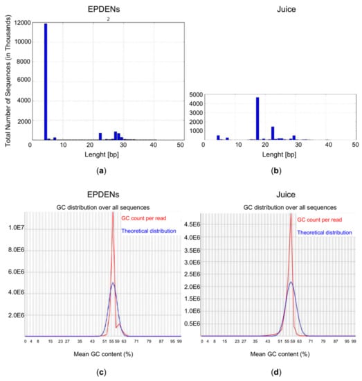 Size distribution of small RNAs of (a) Fragaria-derived EPDENs with respect to (b) Fragaria whole juice. GC frequency of sequences of (c) Fragaria-derived EPDENs with respect to (d) Fragaria whole juice.