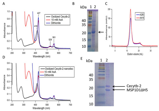 The purification of Cecytb-2 protein and its reconstitution into a nanodisc. (A) UV-visible absorption spectra of purified Cecytb-2 in an oxidized state (black line and in the reduced state by 10 mM AsA (red line) and ~50 mM sodium dithionite (blue line). (B) SDS-PAGE of Cecytb-2 after the Ni-affinity purification; lane (1) protein marker (Prestained XL-ladder, APRO Life Science Institute, Inc, Osaka, Japan); lane (2) Cecytb-2 eluted by the elution buffer containing 350 mM imidazole (black arrow). (C) The SEC of self-assembled Cecytb-2 into a phospholipid bilayer nanodisc; the red line shows the absorbance at 416 nm of the heme group of Cecytb-2 and the blue line shows the absorbance at 280 nm of total protein. (D) UV-visible spectra of the purified fractions of the Cecytb-2-nanodisc complex after the SEC purification; the black line shows the air oxidized state, red and blue lines indicate the reduced states with 10 mM ascorbic acid and with ~50 mM sodium dithionite, respectively. (E) SDS-PAGE of the purified Cecytb-2-nanodisc complex after SEC. Lane (1) protein marker (Prestained XL-ladder (SP-2140), APRO Life Science Institute, Inc, Osaka, Japan); lane (2) Cecytb-2 nanodisc (Cecytb-2, 29,2 kDa and MSP1D1ΔH5, 22.1 kDa).