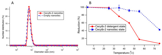 Then, we conducted analyses on the protein thermal stability by incubating Cecytb-2 protein either in a DDM-detergent micelle state or in a nanodisc state at different temperatures. The protein stability was evaluated by the reducibility of heme moiety with sodium dithionite. We observed that there was a notable decrease in the temperature-dependent protein stability for Cecytb-2 in the detergent micelle state, as indicated by the clear decrease in the reduction level at higher temperatures (Figure 2B, red line). By contrast, the nanodisc environments gave much higher protein stability than the detergent micelle state did, as evidenced by the observation that an increase in the incubating temperature up to 55 °C did not cause any significant change in the reduction level (Figure 2B, blue dashed line).