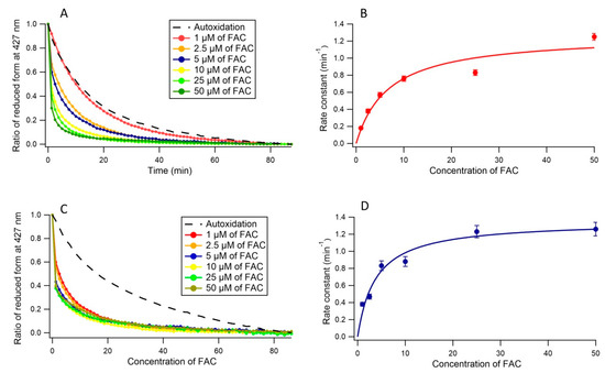 In order to clarify the ferric reductase activity of Cecytb-2 protein, we measured the autoxidation of the ferrous heme of Cecytb-2 under anaerobic conditions. The measurements showed a very slow decay of the reduced heme (k = 0.055 (±0.001) min−1) (Supplementary data, Figure S2). This analysis confirmed that the reduced form of Cecytb-2 in the DDM detergent micelle state is stable enough to conduct the measurements of the ferric reductase activity. A significant increase in the oxidation rate of the reduced heme of Cecytb-2 upon anaerobic addition of FAC (Figure 3A) was observed. The acceleration in the oxidation rate was dependent on the concentration of FAC, suggesting that FAC might be working as a substrate for Cecytb-2. Therefore, the acceleration process was examined by fitting with a double exponential function, where k1 was fixed as the same value with the k of the heme autoxidation process, whereas the other rate constant (k2) was considered as reflecting the ferric reductase activity for FAC. Being consistent with this assumption, the Michaelis–Menten analysis on k2 and the FAC concentrations showed a hyperbolic saturation with Vmax = 1.27 (±0.139) min−1 and Km = 6.75(±2.3) µM; Vmax/ Km = 0.188 min−1/µM, as shown in Figure 3B.