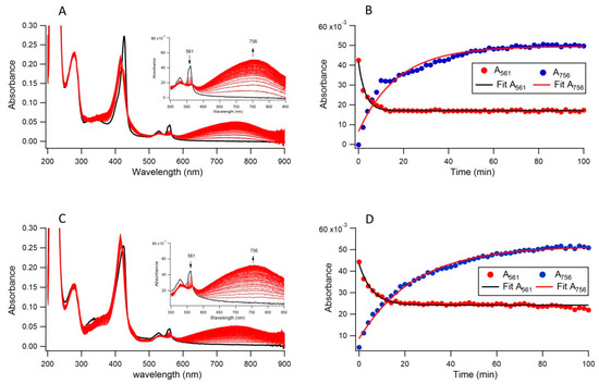Nitroso-PSAP chelates with Fe2+ and forms a Fe2+-nitroso-PSAP complex that displays a characteristic absorption peak at 756 nm with a molar absorptivity of 45 mM−1cm−1 [33]. By utilizing this nature, measurements of the ferric reductase activity of Cecytb-2 were conducted as follows (Fujimura et al., unpublished results). Briefly, spectral changes were continuously recorded in the repeated scan mode upon the anaerobic addition of 2 µM of FAC and 8 µM of nitroso-PSAP to the pre-prepared reduced form of Cecytb-2 (either in nanodisc state or in DDM-detergent micelle state) (2 µM) as previously described. The decay of the reduced heme at 561 nm and the formation of the Fe2+-nitroso-PSAP complex at 756 nm were plotted against time and these changes were fitted using a single exponential equation; y = y0 + A1 × exp(−k1t). A single exponential function was chosen just for the purpose of evaluating the apparent rates. All analyses and fitting were conducted using Igor Pro (v. 6.37).