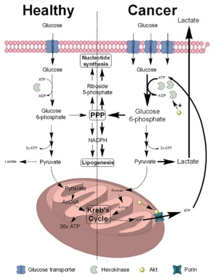 The ability of any mammalian cell to survive relies upon its need to convert fuel, most commonly glucose, into ATP energy. Non-neoplastic tissues do this via the process of oxidative phosphorylation, comprising glycolysis, the Krebs cycle, and the mitochondrial respiratory chain. In contrast, in neoplastic cells, energy metabolism undergoes a metabolic shift, called the Warburg effect, whereby cells rely predominantly upon glycolysis for their energy needs (for a full in-depth review of the Warburg effect in cancer, see []). This change in ATP supply source reduces the number of ATP molecules produced per glucose molecule from a (theoretical) maximum of 38 to 2 []; such a marked decrease seems counterproductive to cell survival at first glance. However, this shift in metabolism is essential for tumour growth and survival as it provides the necessary building blocks for tumour mass production [,] as well as generating a cellular microenvironment which promotes tumour growth over that of surrounding non-neoplastic tissues [,,]. Pyruvate is diverted from entry into the mitochondria and towards the formation of lactate due to increased lactate dehydrogenase A and pyruvate kinase M2 expressions [,]. Additionally, pyruvate dehydrogenase kinase 1 activity is increased, which in turn phosphorylates, and thus inhibits the activity of, pyruvate dehydrogenase, the rate-limiting step in the conversion of pyruvate into acetyl-CoA []. The subsequent increase in cellular lactate is excreted out of the cell. Accumulating glycolysis intermediates are diverted into the pentose phosphate pathway (PPP) to synthesise the biochemical components required for tumour growth, such as nucleotides and lipids [,]. A small proportion of pyruvate enters oxidative phosphorylation, which is essential for regenerating the NAD(P)H used by these pathways, hence mitochondrial activity slows but does not stop (Figure 1) [,]. The decrease in ATP production which arises because of the Warburg effect is thought to be compensated for in part by an increase in the rate of glycolysis [,], fuelled by increased expression of the glucose transporter and subsequent increase in glucose uptake []. Additionally, glycolytic ATP synthesis is approximately 100-fold more rapid than mitochondrial ATP synthesis [], thus cellular ATP can be maintained at levels similar to those observed in healthy cells [].