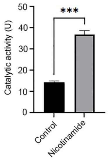 Effect of increased nicotinamide concentration upon NNMT activity in HepG2 hepatocarcinoma cells. Cells were incubated in cell culture media (control) or media supplemented with 100 µM nicotinamide (nicotinamide) for 24 h. Cells were harvested, supernatant prepared and NNMT activity assayed. Results were calculated and expressed as nmol 1-methylnicotinamide produced/hr/mg protein ± S.D. Statistical analysis comprised Student’s t-test with Welch correction (n = 3). *** = p < 0.001.