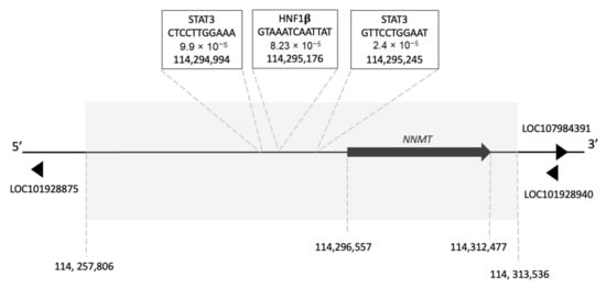 Within the NNMT promoter region, which has been proposed to extend 2 kb upstream of the NNMT coding domain sequence [], several putative transcription factor binding sites (TFBS) have been identified [,,,]; however, only the presence of STAT3 and HNF-1β regulatory sites have been experimentally demonstrated [,,]. We have subsequently performed a more in-depth bioinformatic analysis of the NNMT gene to identify the location of the two known TFBSs, STAT3 and HNF-1β, both within its 5′-flanking region and introns. Using position weighted matrices of STAT3 (MA0114.2) and HNF-1β (MA0153.2) from JASPAR [], the NNMT promoter region and introns were scrutinised for putative TFBS using FIMO [] implemented in the MEME Suite []. In agreement with our previous work [] we identified, with high probability, two putative STAT3 recognition sites (GTTCCTGGAAT and CTCCTTGGAAA) at positions 114,295,245 and 114,294,994 plus a putative HNF-1β recognition site (GTAAATCAATTAT) at position 114,295,176. We also identified further putative STAT3 and HNF-1β TFBS in this region but disregarded them due to either low probability scores or because they were found some distance away from the gene itself.