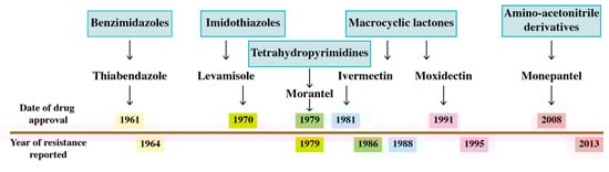 Year of initial drug approval and year of reported resistance in sheep and goats (below line). The individual drugs are colour coded and belong to the major anthelmintic group of drugs currently commercially available. Resistance was reported 3–9 years after the introduction of the drug into the market [,,,,,].