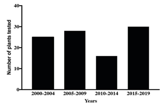 The number of plant extracts tested for anthelmintic activity from 2000 to 2019 according to papers indexed in PubMed, Scopus and Mendeley.
