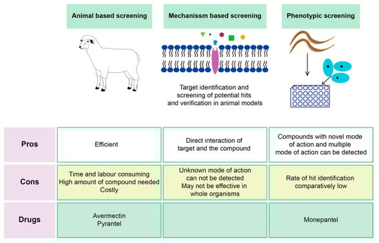 Anthelmintic drug discovery has largely been based on three distinct screening approaches: animal-based screening, target-based screening and nematode phenotypic screening (whole organism-based assay) (Figure 4) [,]. All the available anthelmintic drug classes (at least prototypes of the drug classes) were found through low-throughput screening methods like targeting parasitic species in the host animal or in vitro assays [,]. Animal-based screening is the oldest method of anthelmintic drug discovery and is based on exposing infected animals to test compounds and then monitoring parasite fecundity, survival, and host toxicity. Natural products-based compounds that show some efficacy, often referred to as lead compounds, can be chemically modified to try and enhance the specificity and efficacy, and reduce host toxicity. Test compounds are mainly “new” synthetic or natural compounds; however drug repurposing is also an alternative approach in anthelmintic discovery []. The advantage of repurposing existing drugs can be the substantial reduction in time and cost of getting the drug to market [,].