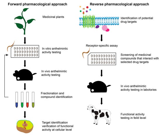 An alternative strategy for new anthelminthic identification is the reverse pharmacological approach which involves target-based drug screening techniques. In this approach, plants are examined, and libraries of molecules are established. The molecules are tested on putative targets, i.e., enzymes or receptors involved in important biological activities in a cell. These chemical libraries are either based on random plants (unbiased compound libraries) or traditional use/knowledge-based libraries []. Some molecules might also act on as yet undefined targets and so would not be identified when screened for activity against putative “druggable” targets such as enzymes, receptors and ion channels and key molecules in cell signalling and biochemical pathways []. The reverse pharmacological approach has the advantage of requiring fewer animal experiments to find new drugs compared to the use of complex compounds which is often time-consuming and cannot guarantee in vivo efficacy.