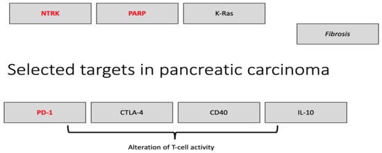 For many years, chemotherapeutic regimens have been the cornerstone of therapy for inoperable pancreatic adenocarcinoma (PC) (i.e., locally advanced or metastatic) and evolved as adjuvant or neoadjuvant treatment for resectable pancreatic carcinoma [,]. Overall, however, pancreatic carcinoma shows only moderate sensitivity to chemotherapy []. This is reflected by the overall dismal prognosis, that has not improved over the last years []. In the following review of the available literature, we would like to provide a summary of novel approaches that specifically aim at targeting the malignant cells and their surroundings, i.e., the microenvironment and the stroma. We will discuss some approaches over the last years that failed and how the positive results for the PARP inhibitor olaparib in the POLO trial finally allow for targeted therapy to become clinically useful in PC [,]. Other well-investigated targets are EGFR, K-RAS, and more recently, NTRK 8 [,,]. As extensive fibrosis is a prominent feature of PC, some of the most interesting approaches at targeting it are included in this review. Immunotherapy has revolutionized the treatment of many solid tumor entities, starting with melanoma, and expanding further since then. PC, however, is amongst the less responsive entities and so far, immunotherapy has not been successful. We summarize novel immunotherapeutic approaches with a focus on combinations of several agents.