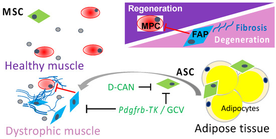 A schematic representation of the working hypothesis. In DMD muscle, resident MSCs and adipose stromal cells (ASCs) serve as a source of fibroadipogenic progenitors (FAPs) that promote fibrosis, suppress the activity of muscle progenitor cells (MPCs), and promote DMD pathogenesis. Ablation of proliferating MSCs (by TK/GCV suicide gene therapy) or ASCs (with D-CAN) is expected to suppress DMD progression.