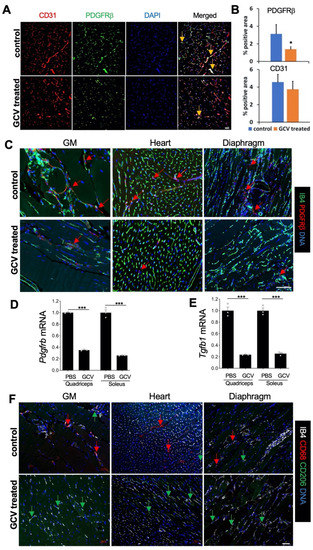 For genetic ablation of PDGFRβ+ lineage MSCs, we used Pdgfrb-TK mice in which viral TK is expressed under the control of the PDGFRβ promoter [51]. In response to ganciclovir (GCV) treatment, only proliferating (but not quiescent) PDGFRβ-expressing cells are depleted in these mice. The proliferation of PDGFR+ FAPs is a requisite of both fibrosis and adipocyte expansion [52] demonstrated in DMD models [34] and models of aging [53]. Therefore, we predicted the inducible TK/GCV approach to be safe for healthy muscle because MSCs do not normally proliferate. An exception is WAT, in which PDGFRβ ASC depletion with the TK suicide gene prevents obesity development [45]. First, we confirmed that the approach is effective for depleting MSCs from skeletal muscle. Pdgfrb-TK mice were GCV-treated, and the gastrocnemius (GM) muscle was harvested, sectioned, and immunostained with antibodies against CD31 and PDGFRβ. Immunofluorescence quantification demonstrated that the frequency of PDGFRβ-expressing cells was significantly reduced after Pdgfrb-TK mice treated with GCV compared to non-treated control, while CD31 expression was not significantly different between treated and non-treated groups (Figure 2A,B).