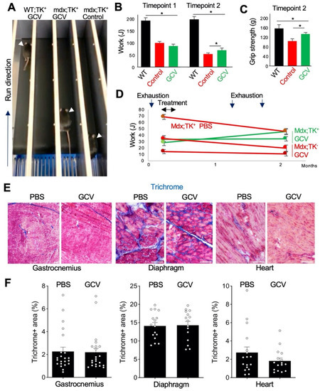Depletion of PDGFRβ-lineage cells in mdx mice. (A) A snapshot of the treadmill test revealing increased endurance of mdx/Pdgfrb-TK mice treated with GCV compared to control (PBS) treatment. (B) Long-term endurance improvement in mdx/PDGFRb-TK mice treated with GCV. * p < 0.05, n = 4 (Student’s t-test). (C) Long-term grip strength improvement in mdx/PDGFRb-TK mice treated with GCV. * p < 0.05, n = 4 (Student’s t-test). (D) Timeline of experiment showing endurance improvement in mdx/Pdgfrb-TK mice treated with GCV. (E) Masson’s trichrome staining showing decreased regression and disorganization of myofibers and reduced fibrosis in muscle of mdx/Pdgfrb-TK mice treated with GCV. (F) Quantification of Masson’s trichrome staining-positive area in gastrocnemius, diaphragm, and cardiac muscle, n > 15. Scale bar: 50 µm.