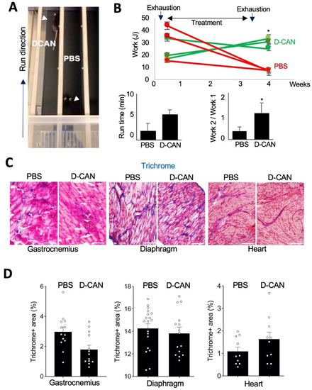 (A) A snapshot of the treadmill test revealing increased endurance of mdx mice treated with D-CAN. (B) The timeline of experiment showing endurance improvement in mdx mice treated with D-CAN graphed underneath. Work at timepoint 1 was set as 1, and relative change at timepoint 2 is shown. N = 3. * p < 0.05. (C) Masson’s trichrome staining of gastrocnemius muscle from individual mice showing less regression and disorganization of fibers in D-CAN-treated mice. (D) Quantification of Masson’s trichrome staining-positive area in gastrocnemius, diaphragm, and cardiac muscle, N > 12. Scale bar: 50 µm.