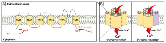 Structurally, TRPC channels are relatively analogous [,]. They can form heterotetramers or homotetramers. Each TRPC channel consists of at least six transmembrane domains with an ionic pore formed between TM5 and TM6 (Figure 3). On the N-terminal cytosolic domain, there are four to five ankyrin repeats, leading to protein–protein interactions [,]. On the C-terminal side, the TRP domain, a well-conserved region in all TRPCs, is essential for channel gating [], followed by the calmodulin (CaM)/inositol 1,4,5-trisphosphate receptor-binding (CIRB) site, with CaM binding in a Ca2+-dependent manner [,,]. Interestingly, incorrect trafficking of TRPC3 was observed when the CIRB region was deleted [].