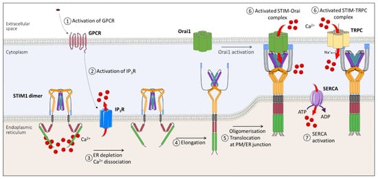 Activation mechanism of store-operated Ca2+ channels. Depletion of intraluminal Ca2+ concentration triggers Ca2+ dissociation of the EF hand of STIM1, allowing elongation and oligomerization of STIM1 at the ER–PM junction. This allows the interaction of STIM1 with Orai1 and/or TRPC channels, allowing Ca2+ entry into the cytoplasm. ADP, adenosine diphosphate; ATP, adenosine triphosphate; ER, endoplasmic reticulum; GPCR, G-protein coupled receptor; IP3R, inositol 1,4,5-trisphosphate receptor; PM, plasma membrane; SERCA, sarcoplasmic/endoplasmic reticulum Ca2+−ATPase; TRPC, transient receptor potential canonical channels.