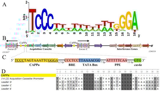 Relative to S. solfataricus, S. islandicus Rey15A harbors a smaller ensemble of CRISPR loci and CRISPR-associated (cas) genes. Liu et al. localized a Csa3a binding site in the promoter of the Rey15A acquisition cassette, and expanded on that in 2017 by reporting 24 bp pseudo-palindromic binding sites in the leader sequences of the two CRISPR loci as well [23,25]. They also identified similar sequences in S. solfataricus upstream of the I-A (2) acquisition cassette and in the leader sequences of the C, D and E CRISPR loci. Similarly, our own analysis identified these same sequences. Importantly, when we analyzed these sequences with MEME, we identified a consensus 18-bp palindromic motif that is conserved in 27 members of the order Sulfolobales (Figure 1A). Further, this motif is generally absent from the promoters of non-CRISPR-associated genes in S. solfataricus; i.e., it is a CRISPR-associated promoter palindrome (CAPP). To differentiate this motif from an unrelated binding site reported for Csa3b [24], we refer to this motif as CAPPa. The CAPPa element is present 12 bp upstream of the BRE and TATA box for the I-A (2)-associated acquisition genes [25], consistent with a role in transcriptional regulation of the acquisition cassette, as well as the leader sequences of CRISPR loci C, D and E (Figure 1). Last, we also find a nearly exact correspondence between the occurrence of Csa3a and the CAPPa motif in these genomes (Tables S5 and S6).