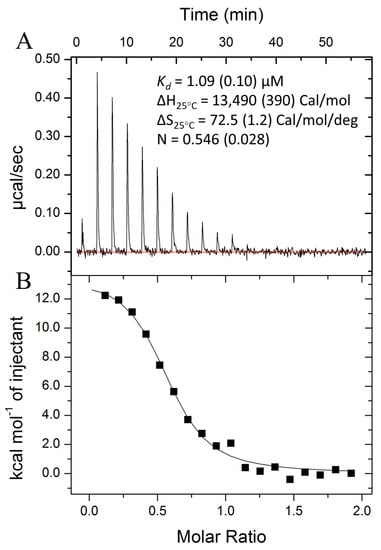Protein samples were prepared by passage over a Superdex 75 as described above. Lyophilized cA4 was resuspended in the same SEC buffer used to prepare Csa3. These Csa3a and cA4 stocks were centrifuged at 17,000× g for 10 min to remove any aggregates, and the UV absorbance of the samples was measured to determine concentrations (ε280nm for Csa3a = 8960 M−1 cm−1 and ε259nm for cA4 = 54,000 M−1 cm−1), with samples prepared by dilution into the same buffer (25 µm Csa3a dimer, 250 µM or 500 µM cA4). In a MicroCal ITC200 (Malvern Panalytical, Malvern, UK), 250 µM or 500 µM cA4 was injected (19 injections of 2 μL at 180 s intervals) into a cell chamber containing 207 μL of Csa3a dimer (25 μM). Isotherms were fit to a single-site model with ORIGIN software (MicroCal, Northhampton, MA, USA), assuming a single cA4 binding site in each Csa3a dimer. Titrations were performed in duplicate. The averaged results are reported in Table S1.