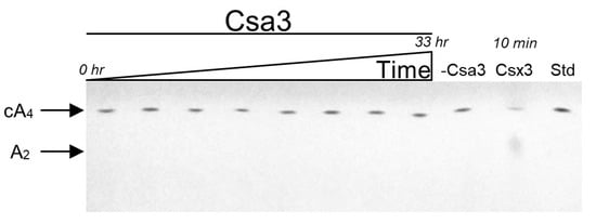 CARF domain proteins, like Sso1393, frequently exhibit low-level ring nuclease activity that attenuates their activation by cA4 [40,43,44,45]. To determine if Csa3a possesses ring nuclease activity and is potentially self-regulating, unlabeled cA4 was incubated with Csa3a for up to 33 h (Figure 3). We observed no cA4 degradation, suggesting the Csa3a CARF domain acts as a signal receptor, but is not involved in clearing the cA4 signal. In this regard, we note that Csa3a lacks a putative catalytic lysine residue found in many CARF ring nucleases [40].