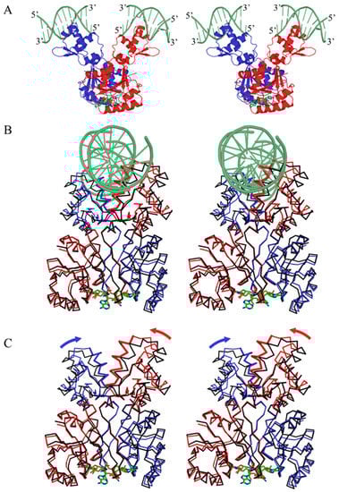 cA4-induced conformational changes. (A) Divergent stereo image of the Csa3a/cA4 complex docked to DNA (light green) by superposition of individual wHTH domains onto B. subtilis OhrR (PDB code: 1Z9C [47]) (RMSD: 1.7 Å). We were unable to superposition the Csa3a dimer onto a single strand of B-form DNA, suggesting further conformational changes in Csa3a or DNA bending might occur. (B) Significant movement of the wHTH domains is seen at the putative protein/DNA interface in the Csa3a/cA4 complex (blue and red) relative to the unbound structure (black). (C) The rotation of the wHTH domains (direction emphasized by arrows) relative to the CARF domain is a result of modest conformational changes in the CARF domain.