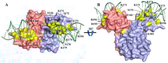 Our previous multiple sequence alignment did not differentiate between Csa3a and Csa3b [6]. While this alignment nicely identified the conserved cA4 binding site, considering the different DNA sequences recognized by S. islandicus Csa3a and Csa3b [24,25,48], it might not be expected to identify conserved residues involved in DNA recognition. We thus constructed a new multiple sequence alignment with 21 Csa3a sequences. The alignment identifies three strictly conserved residues in the recognition helix—E173, K174 and N178—that are positioned to make base-specific interactions. Additional conserved resides positioned to interact with the ribose-phosphate backbone include E146, E147, K171, S172, T175, K179, E182, K184, G193, D195 and R196 (Figure 6).