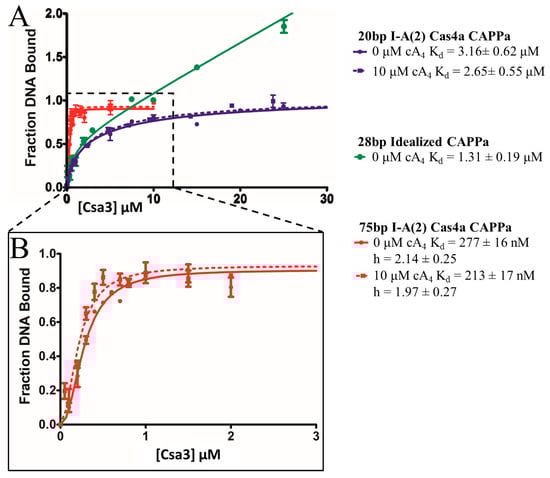 We first examined the affinity of Csa3a for a 20 bp fragment centered on CAPPa in the I-A (2) cas4 promoter. Surprisingly, the affinity for this smaller 20 bp fragment was only 3.2 +/− 0.6 µM, much less than for the 350 bp fragment used in the EMSA assay (Figure 8). Critically, a statistically significant increase in affinity in the presence of cA4 (Kd = 2.7 +/− 0.6 µM) was not observed. We also observed binding was no longer cooperative, which might be explained by the smaller DNA fragment (20 bp) which is able to accommodate only a single Csa3 dimer. Indeed, when we instead used a 75 bp fragment, extending in the upstream direction away from the BRE and TATA elements, cooperative binding was restored, along with the higher affinity (Kd = 270 +/− 20 nM) previously observed in the EMSA assays. However, cA4 again failed to provide a significant increase in affinity (Kd = 210 +/− 20 nM). We thus concluded that S. solfataricus Csa3a binds CAPPa nonspecifically, in a cA4-independent manner. This is clearly at odds with a simple model wherein cA4 increases the affinity of Csa3a for CAPPa, Csa3a then binds CAPPa, with subsequent recruitment of TFB, TBP and RNA polymerase. Given the data supporting transcriptional control of the acquisition cassette and CRISPR loci in S. islandicus [23,25], alternative models for the initial high-affinity interaction involving additional proteins might need to be considered.