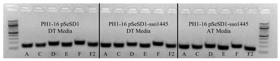 S. solfataricus PH1-16 (ΔpyrEF) was cultured in DT media (with 20 μg/mL uracil) at 78 °C and shaken at 65 rpm. An empty pSeSD1 vector and pSeSD1 containing S. solfataricus P2 csa3a (pSeSD-sso1445) were transformed into PH1-16 cells via electroporation [9,39], and transformants were selected for via growth in DT media without uracil. Cultured transformants were plated on 0.7% GelRite DT media plates and incubated at 78 °C until colony formation. A monoculture of transformed cells was started via inoculation of DT media with a single colony [9].