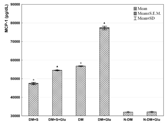 MCP-1 level in the supernatant from a culture of human PBMCs isolated from statin-treated or statin-free type 2 diabetic patients, or from non-diabetic controls in the medium only, or preincubated with glucose (ANOVA). *—statistically significant difference compared with other groups at basic conditions, for p ≤ 0.05; ▲—statistically significant difference compared with other groups in the presence of glucose, for p ≤ 0.05.