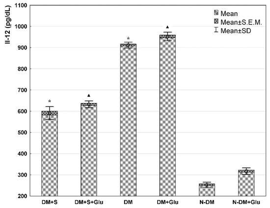 IL-12 level in the supernatant from a culture of human PBMCs isolated from statin-treated or statin-free type 2 diabetic patients, or from non-diabetic controls in the medium only, or preincubated with glucose (ANOVA). *—statistically significant difference compared with other groups at basic conditions, for p ≤ 0.05; ▲—statistically significant difference compared with other groups in the presence of glucose, for p ≤ 0.05.