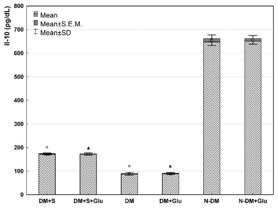 IL-10 level in the supernatant from a culture of human PBMCs isolated from statin-treated or statin-free type 2 diabetic patients, or from non-diabetic controls in the medium only, or preincubated with glucose (ANOVA). *—statistically significant difference compared with other groups at basic conditions, for p ≤ 0.05; ▲—statistically significant difference compared with other groups in the presence of glucose, for p ≤ 0.05.