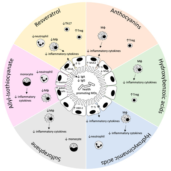 Table 1 provides an overview on the effects of these compounds on inflammatory markers in different model systems. Figure 1 summarizes the proposed effects of food-derived plant bioactive compounds on the intestinal mucosal immune system.