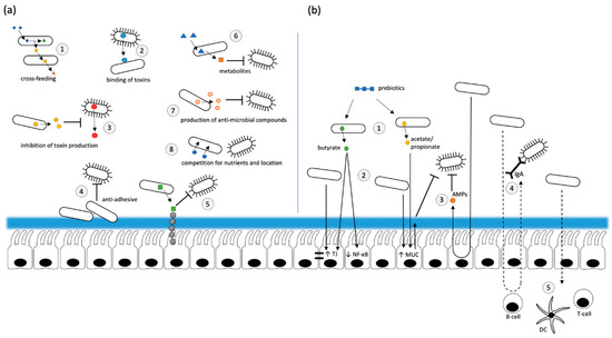 (a) Indirect probiotic effects on the intestinal barrier. By cross-feeding, generated metabolites from one bacterial strain may be utilized by another strain resulting in the generation of various other metabolites consequently affecting the gut barrier (1). The damaging effect of pathogen-generated toxins may be attenuated through toxin binding (2) and an inhibition of toxin production (3). A direct interaction of pathogenic bacteria with the host’s intestinal epithelial cells may be prevented by both, a formation of biofilms (4) and a competition for binding sites (5). The growth of intestinal pathogens may be inhibited by different mechanisms mediated by probiotics: Either through specific probiotic metabolites (6), the production of anti-microbial compounds (7) or a competition for nutrients/localization (8). (b) Direct effects of probiotics on the host. The intestinal barrier may be strengthened by the generation of short chain fatty acids such as butyrate, propionate and acetate through a metabolization of prebiotics (1) as well as through direct interactions of probiotics with epithelial cells (2) consequently improving tight junctions (TJ) and mucin (MUC) production and inducing anti-inflammatory effects. A potential contact of pathogens with the intestinal barrier may be inhibited by the generation of antimicrobial peptides (AMPs) (3) and the secretion of IgA (4). Additionally, probiotics may directly affect different intestinal immune cells (e.g., dendritic cells (DC), or T-cells) and consequently the intestinal inflammatory response (5).