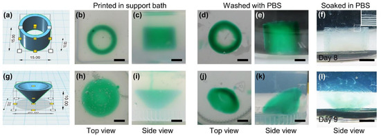 Blueprints of (a) cylindrical and (g) conical 3D constructs, and (b,d,h,j) top and (c,e,f,i,k,l) side views of HA-Ph hydrogel constructs obtained by extruding an ink containing 1.25% (w/v) HA-Ph, 5 U/mL HRP, and 5 mM choline chloride in PBS into a support bath containing 1.0% (w/v) XG and 0.5 U/mL COD in PBS. The constructs (b,c,h,i) just after printing in supported bath, (d,e,j,k) after washing with PBS for removing XG, and after (f) 8 and (l) 9 days of soaking in PBS. The image with a solid white border in panel (f) is a magnified view of the part with a dashed border in the same panel. Bars: 5 mm.