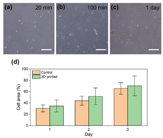 Mouse fibroblast 10T1/2 cells released on a cell culture dish from degraded cell-laden HA-Ph hydrogel by soaking in a medium containing hyaluronidase. Cell morphologies at (a) 20 min, (b) 100 min, and (c) 1 day after treatment for degradation. Growth profiles of the released cells (3D printed) and of those not exposed to 3D printing (control) are expressed in terms of cell area on the cell culture dish. Bars in panels (a–c): 200 µm and panel (d): standard deviation (n = 3).