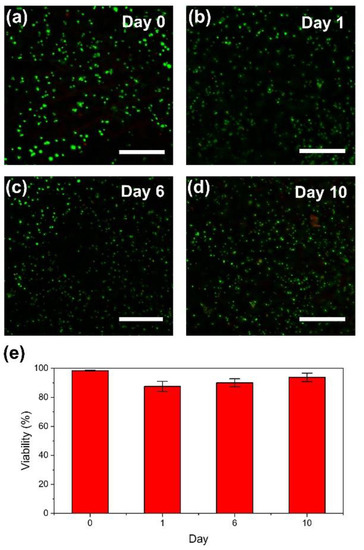 (a–d) Fluorescence microphotographs of mouse fibroblast 10T1/2 cells enclosed in bioprinted HA-Ph hydrogel discs: (a) immediately after printing, at (b) 1 day, (c) 6 days, and (d) 10 days after printing. Live and dead cells showed green fluorescence, attributed to Calcein-AM, and red fluorescence, attributed to PI, respectively. (e) Viabilities of the enclosed cells. Bars in panels (a–d): 200 µm, and in panel (e): standard deviation (n = 3).