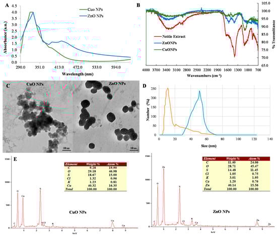 Electron microscopy and spectroscopy characterization of the phyto-synthesized CuO and ZnO nanoparticles, (A) UV-Vis spectra, (B) FT-IR spectroscopy analysis, (C) Transmission electron microscopy analysis, (D) Dynamic light scattering spectroscopy, and (E) SEM-EDS (Energy dispersive spectroscopy) spectra.