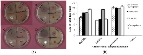 Antimicrobial activity of the synthesized NPs against (a) Optical images depicting AMA against (A) E. cloacae MTCC 509, (B) Salmonella, (C) Staphylococcus aureus, and (D) Campylobacter; (b) Graphical representation depicting comparative AMA (ZOI in mm) of synthesized NPs, antibiotic, and nettle extract.