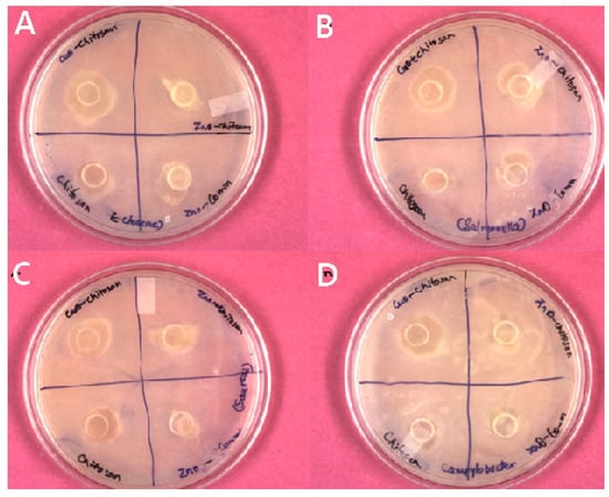 Antimicrobial activity of the chitosan nanocomposite films against (A) E. cloacae MTCC 509, (B) Salmonella, (C) Staphylococcus aureus, and (D) Campylobacter.