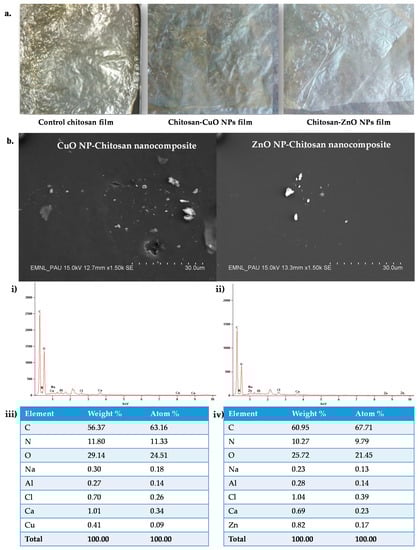 Optical images and Scanning electron micrographs of the synthesized chitosan nanocomposite films. (a) Optical images of chitosan control and nanocomposite films; (b) SEM image depicting the film surface and SEM-EDS spectra of the CuO and ZnO-chitosan nanocomposite films; (i) EDS spectra of Chitosan-CuO NPs films, (iv) (ii) EDS spectra of Chitosan-ZnO NPs nanocomposite film, (iii) Table depicting EDS quantitative results for Chitosan-CuO NPs films, (iv) Table depicting EDS quantitative results for Chitosan-ZnO NPs films.