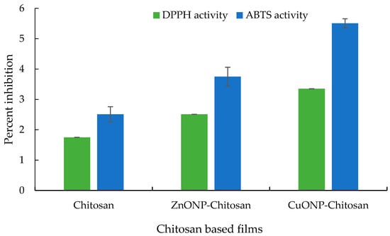 The chitosan nanocomposite films (50 mg) were placed in methanol and homogenized properly in an autoclaved pestle and mortar kept in crushed ice for 10 min. The crushed sample was collected and centrifuged at 15,000× g for 15 min in a refrigerated centrifuge (Remi CPR-30 Plus, Mumbai, Maharashtra, India) at 5 °C. The pellets were discarded, and the supernatant was then filtered through filter paper (Whatman qualitative filter paper, grade 1, Buckinghamshire, United Kingdom). The filtrate obtained was assayed for DPPH radical scavenging activity in triplicate []. The ABTS (2,2′-azino-bis(3-ethylbenzothiazoline-6-sulfonic acid) scavenging activity was evaluated as per the method of Zheng et al. with some modification [].