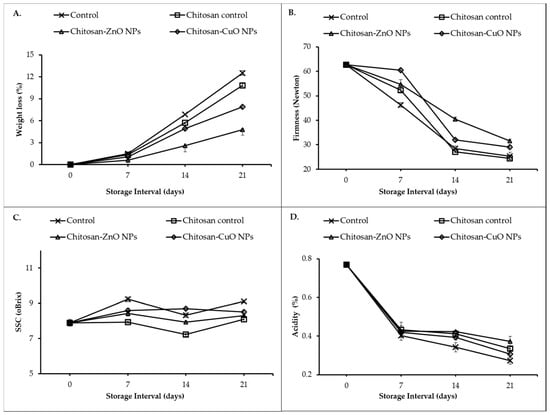 The effect of packaging of guava fruits in chitosan nanocomposite films was assessed based on various fruit quality attributes. Fruit weight loss (%) is a common fruit quality trait. Primarily evapotranspiration and respiration are the major causes of the loss of weight of the fruits during storage []. However, the weight loss in guava which exhibits climacteric behavior, postharvest ripening process continues leading to ethylene hormone-induced degradation of the hemicellulose content in the fruits and fruit softening. Application of chitosan alone as fruit coating retards ripening in guava due to suppression of the respiration rate besides inducing antioxidant activities through significant enhancement in the peroxidase activity []. The incorporation of the ZnO and CuO NPs as filler agents in chitosan polymer must have further improved the gas barrier properties of the polymer thereby decreasing the respiration rate, and ethylene-induced ripening effects due to elicitation of the fruit’s native antioxidant activities. The decreased weight loss can also be indirectly attributed to maintenance of the acid content (titratable acidity) in the nanocomposite film packaged fruits (Figure 7D, Table 3). It can also be identified that there exists a direct relationship among the moisture content and the film solubility. The films with high MC exhibit high WHC and FS and low water barrier properties. The ZnO/CuO NP-chitosan films improved the water and gas barrier properties therefore, these led to decrease in the MC, WHC and FS properties of the developed chitosan nanocomposite films.