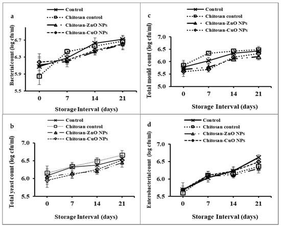 Microbial viable counts (log cfu/mL) of the wash water of guava fruits packaged in chitosan/chitosan nanocomposite films at different days of storage. (a) Total bacterial count, (b) yeast count, (c) mold count and (d) enterobacterial count.