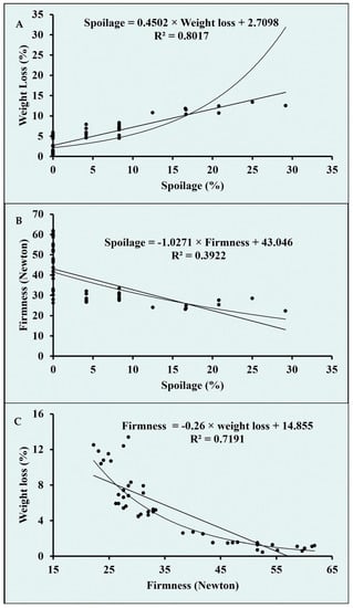 Correlation graphs between physiological and sensory quality parameters of Guava. (6.2 log cfu/mL) were observed on the fruit surface packaged with CuO NPs-chitosan film. (A) Correlation between spoilage (%) and weight loss (%), (B) Correlation between spoilage (%) and firmness, (C) Correlation between firmness and weight loss (%).
