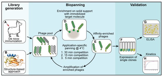 For each library, three subsequent biopanning steps were performed (Figure 1C–E). In each biopanning step, the experimental conditions were adjusted and the stringency, increased. For the first biopanning step, 100 µL of streptavidin-coated MyOne DynaBeads (Thermo Fisher Scientific, Waltham, MA, USA) were loaded with a total of 200 pmol biotinylated target protein (shGFP2-ALFA). The mixture was incubated for 1 h at room temperature, washed three times with 1 mL of phosphate-buffered saline (PBS) and added to a phage suspension containing 2.0 × 1012 phages pre-blocked with 20 µg/mL bovine serum albumin (BSA). The suspension was incubated for 1 h at room temperature, transferred to a 4 °C environment and washed once at 4 °C for 30 min with 10 mL of PBS. The remaining binders were eluted at 4 °C with 0.5 mL of PBS containing a 1000-fold excess of ALFA peptide (200 pmol target protein, 200 nmol ALFA peptide). Eluted phages were used to infect E. coli TG1 cells for 1 h at 37 °C. The infected TG1 cells were grown overnight at 37 °C. The next day, the culture was diluted and grown to an optical density (OD) of 0.6 before infection with a MK13KO7 helper phage for 1 h at 37 °C. The phages were selected by adding kanamycin (50 µg/mL) and grown overnight at 30 °C. The next day, the phages were purified from the cleared culture supernatants by repeated precipitation with 5% PEG-8000 and 1.5 M NaCl (final concentrations in suspension: 1% PEG-8000 and 300 mM NaCl) and resuspended in a final volume of 4 mL of resuspension buffer. The second biopanning step was performed in a similar way while reducing the amount of target protein (ALFA-biotin) immobilized on the beads to 20 pmol and the elution time to 15 min at 4 °C. For the last biopanning step, 20 pmol of biotin-ALFA was used as a bait. The elution time was reduced to 5 min at 4 °C.